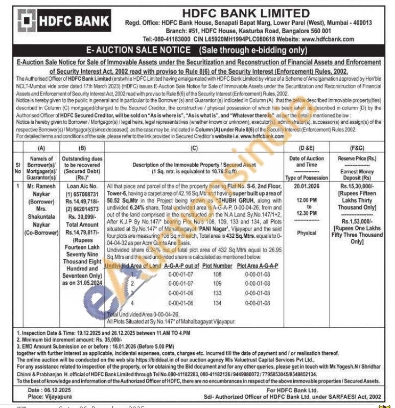 All that piece and parcel of the of the property bearing Flat No. S-6, 2nd Floor, Tower-6, having a carpet area of 42.16 Sq.Mtr and having super built up area of 50.52 Sq.Mtr in the Project being known as "SHUBH GRUH, along with undivided 6.24% share, Total undivided area is A-G-A-P, 0-00-04-26, from and out of the land comprised in the constructed on the N.A Land Sy.No. 147/1+2, After K.J.P Sy No.147/" bearing Plot No's 108, 109, 133 and 134, all Plots situated at Sy.No.147" of Mahalbagayat 'PANI Nagar', Vijayapur and the said four plots are measuring 108 Sq.mtreach, Total area is 432 Sq.Mtrs. equals to 0-04-04-32 as per Acre Gunta Ane Basis. Undivided share 6.24% out of total plot area of 432 Sq.Mtrs equal to 26.95 Sq.Mtrs and the said undivided share is calculated as mentioned below Undivided Area of Land A-G-A-P out of Plot Number Total Undivided Area 0-00-04-26, All Plots Situated at Sy No. 147' of Mahalbagayat Vijayapur