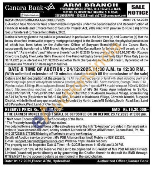 Details and full description of the property: 1) All that Part and parcel of land with shed including plant and machinery(Inkjet printer with eyemark sensor & encoder, Water cooler 3TR, Servo stabilizer, Storage Tanks 10 KL, Pipeline valves & fittings. Electrical pannel board, Single head servo 1 speed AFFS machine to pack 500ml & 1000ml micro filter.rewinding machine with auto speed control) of M/s Sri Rama Agro Industries in Sy.Nos. 155/E3/1/1/2/1/1/1, 155/Ee3/1/1/2/1/1 and 153/Ee3/1/1/2/1/1/2 of Kudakuda Revenue Village, admeasuring 847.00 Sq Yards (Equivalent to 708.19 Sq. Mts), Situated at Kudakuda Village, Chivemia Mandal, Suryapet District, within limits of suryapet municipality bounded by North: Land of B Saidulu, South: Road, East: Land of B Pulya Naik, West:Land of K Venkanna