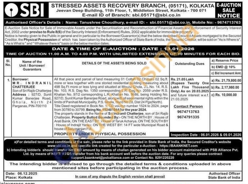 All that piece and parcel of land measuring 01 Cottah 02 Chittaks 02 Sq.ft. more or less together with one storied residential building measuring about 498 Sq. Ft more or less lying and situated at Mouza Ghola, J.L.No. 14, R.S. No. 103, R.S. Dag No. 1350 corresponding L.R. Dag No. 2059 under R.S. Khalian No. 97/2 corresponding L.R. Khatian No. 8688, being Holding No. 927/D, Sunit Kumar Banerjee Road, alongwith all easemental rights within the limits of Panihati Municipality, P.S. Ghola, Ward No.28, Dist 24 Pgs (North) Title Deed registered in Book No. 1, CD volume number 1524 to 2024, page from 30780 to 30799. Being No. 152401044 for the year 2024. The property stands in the Name of Sri Indranil Chatterjee, son of Sri Rajib Chatterjee. Property Butted Bounded By:-ON THE NORTH BY: House of Arati Banik, ON THE EAST BY: House of Taruk Acharya, ON THE SOUTH BY House of Indrajit Yadav, ON THE WEST BY: 14 FT wide Municipal Road & house of Satyaranjan Pal.