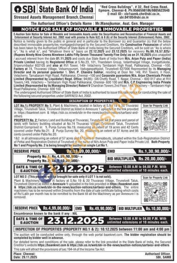 PROPERTY No. 2: Factory Land and Building at Thuvarasi, Tirunelveli: All that piece and parcel of lands with factory building situated at No.74 Thuvarasi Village, Tirunelveli Taluk, Tirunelveli District Comprised in: 1. Punja Survey No. 19, measuring an extent of 19 acres and 42 Cents covered under Patta No.21. 2. Punja Survey No. 20, measuring an extent of 37 Acres and 95 cents covered under Patta No 20. 1&2 in all admeasuring an extent of 57 acres and 37 Cents or thereabouts, situated within the Sub-Registration District of Pettai and Registration District of Tirunelveli in the name of M/s Arjun Pulp and Paper India Private Ltd. Both Property No 1 and Property No. 2 is being brought for auction as single Lot No 1.