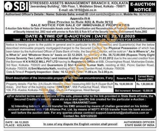 Property details: Flat No-2/A (South-Western side), measuring 660 Sq ft (Super Built Area), 2nd floor of the building name: "SREEMA", 958 Purbachal Road, Ward No: 106, P.S.-Kasba. Kolkata-700078, Dist.-South 24 Paraganas, West Bengal.