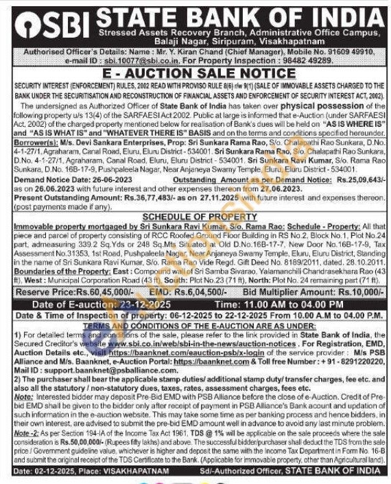 Immovable property mortgaged by Sri Sunkara Ravi Kumar, S/o. Rama Rao: Schedule - Property: All that piece and parcel of property consisting of RCC Roofed Ground Floor Building in RS No.2, Block No. 1, Plot No.24 part, admeasuring 339.2 Sq. Yds or 248 Sq.Mts Situated at Old D.No. 168-17-7, New Door No. 168-17-9, Tax Assessment No.31353, 1st Road, Pushpaleela Nagar, Near Anjaneya Swamy Temple, Eluru, Eluru District, Standing in the name of Sri Sunkara Ravi Kumar, Slo. Rama Rao Vide Regd. Gift Deed No. 8189/2011, dated. 28.10.2011. Boundaries of the Property: East: Compound wall of Sri Samba Sivarao, Yalamanchili Chandrasekhara Rao (43) ft), West: Municipal Corporation Road (43 ft), South: Plot No.23 (71 ft), North: Plot No. 24 remaining part (71 ft).