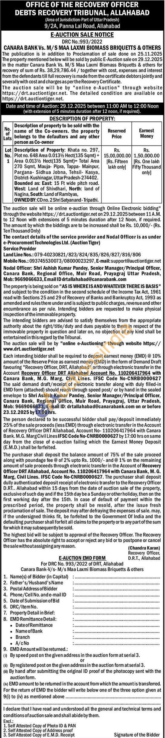 Description of Property: Khata no. 297, Plot no. 648 Area 0.013½ Hect(135 Sqmt) + Area 0.013½ Hect(135 Sqmt)= Total Area 270 Sqmt, Mauja- Pipra, Tappa- Mainpur, Pargana- Sidhua Jobna, Tehsil- Kasya, District-Kushinagar, Uttar Pradesh-274402. Bounded as: East: 15 Ft wide pitch road. West: Land of Shivdhari, North: land of Nagina, South: Land of Rambyas,
