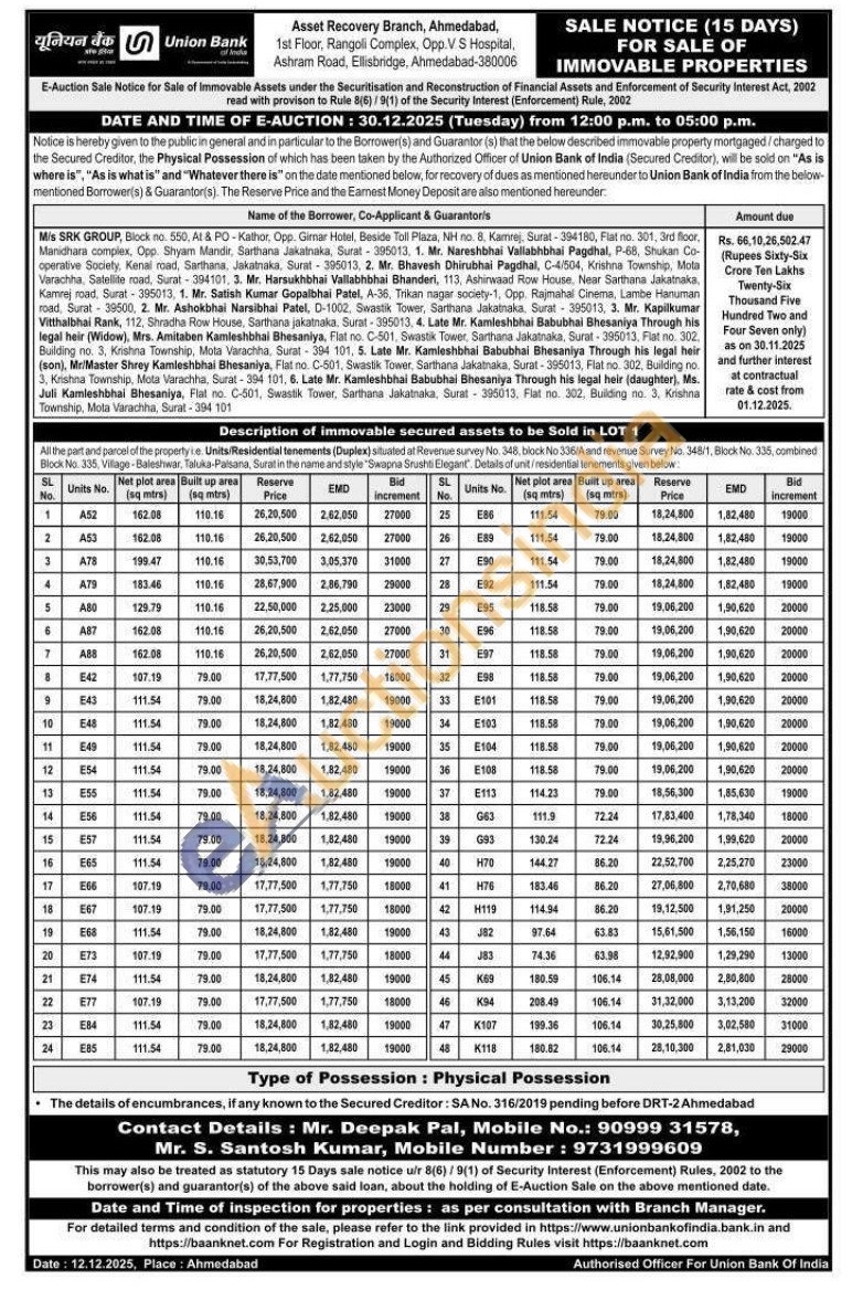 All the part and parcel of the property ie. Units/Residential tenements (Duplex) situated at Revenue survey No. 348, block No 336/A and revenue Survey No. 348/1, Block No. 335, combined Block No. 335, Village-Baleshwar, Taluka-Palsana, Surat in the name and style "Swapna Srushti Elegant. Details of unit /residential tenements given below: