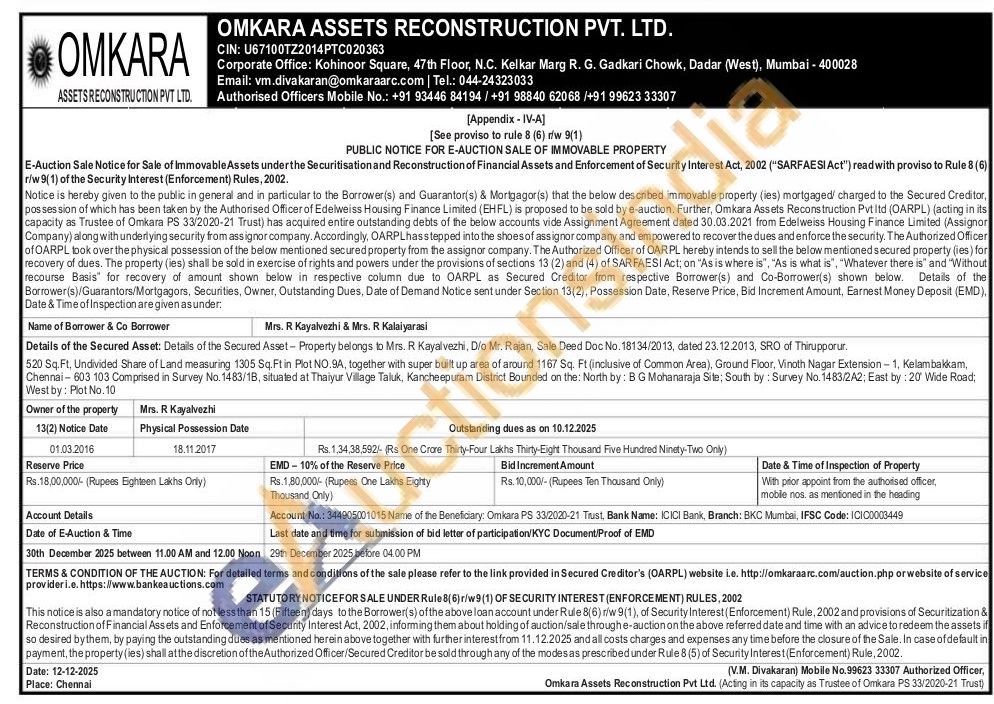 Details of the Secured Asset: Details of the Secured Asset-Property belongs to Mrs. R Kayalvezhi, D/o Mr. Rajan, Sale Deed Doc No. 18134/2013, dated 23.12.2013, SRO of Thirupporur. 520 Sq. Ft, Undivided Share of Land measuring 1305 Sq. Ft in Plot NO.9A, together with super built up area of around 1167 Sq. Ft (inclusive of Common Area), Ground Floor, Vinoth Nagar Extension-1, Kelambakkam, Chennai-603 103 Comprised in Survey No. 1483/1B, situated at Thaiyur Village Taluk, Kancheepuram District Bounded on the: North by: BG Mohanaraja Site; South by: Survey No. 1483/2A2; East by: 20 Wide Road; West by: Plot No.10