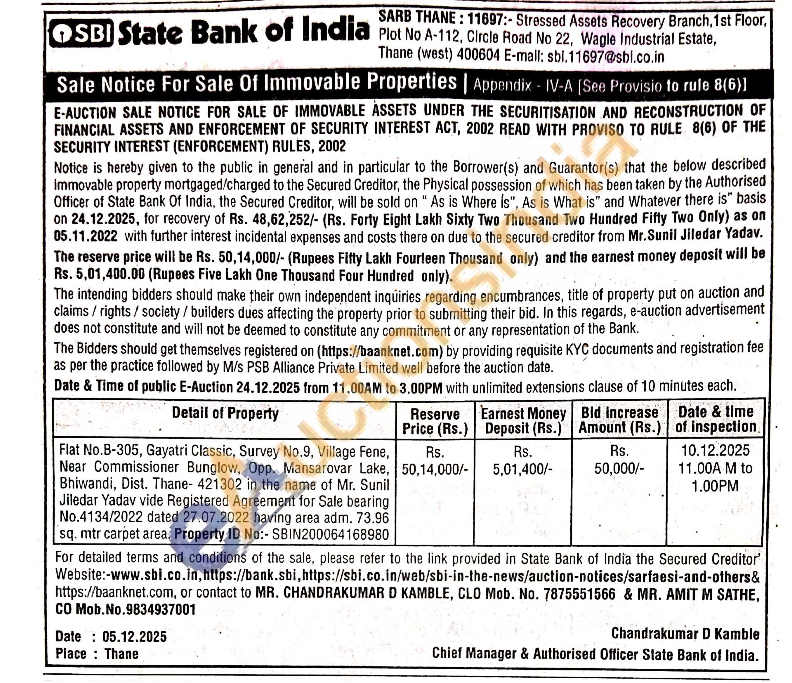 Flat No.B-305, Gayatri Classic, Survey No.9, Village Fene, Near Commissioner Bunglow, Opp. Mansarovar Lake, Bhiwandi, Dist. Thane- 421302 in the name of Mr. Sunil Jiledar Yadav vide Registered Agreement for Sale bearing No.4134/2022 dated 27.07.2022 having area adm. 73.96 sq. mtr carpet area. Property ID No:- SBIN200064168980