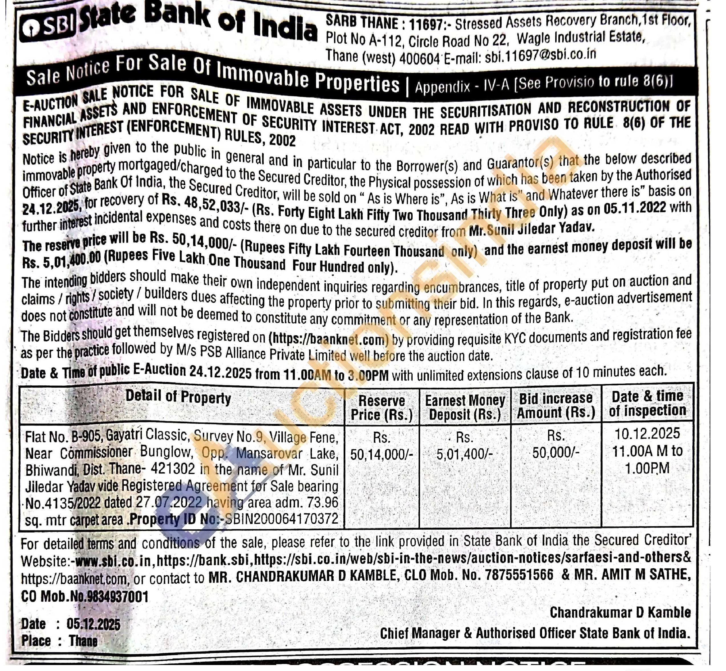 Flat No. B-905, Gayatri Classic, Survey No.9, Village Fene, Near Commissioner Bunglow, Opp. Mansarovar Lake, Bhiwandi, Dist. Thane- 421302 in the name of Mr. Sunil Jiledar Yadav vide Registered Agreement for Sale bearing No.4135/2022 dated 27.07.2022 having area adm. 73.96 sq. mtr carpet area. Property ID No:-SBIN200064170372