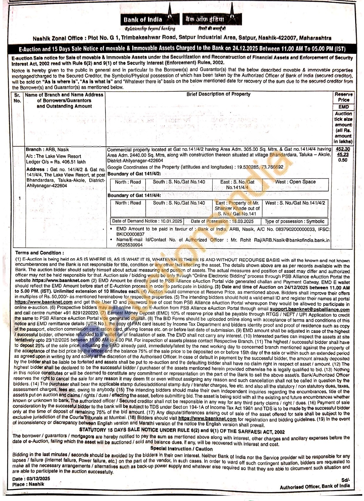 Commercial property located at Gat no. 141/4/2 having Area Adm. 305.00 Sq. Mtrs. & Gat no. 141/4/4 having Area Adm. 2440.00 Sq. Mtrs, along with construction thereon situated at village Bhandardara, Taluka Akole. District-Ahilyanagar-422604 Google Coordinates of the Property (lattitudes and longitudes): 19.530285, 73.766692 Boundary of Gat 141/4/2: North: Road South: S. No./Gat No.140 East: S. No./Gat No.141/4/4 West: Open Space