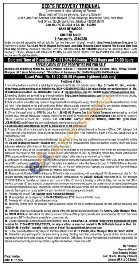 Agricultural Land Having Khasra No. 328/3, Patwari Halka No. 17, situated at Village-Shivana, Tehsil-Zirniya, District-Khargone (M.P.) Area Admeasuring 1.775 Hectare, in the name of Shri Chattar Singh S/ Shri Shobharam