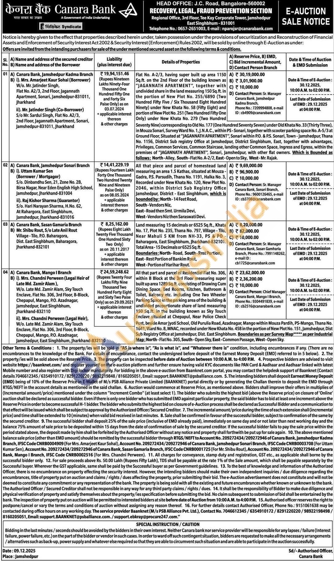 All that part and parcel of Residential Flat No. 306, within B Block at the 3rd Floor measuring super built up area 1289 Sq.ft. consisting of Drawing Cum Dining Space, Bed Rooms, Kitchen, Bathroom & Toilet, Balcony etc. including One Two Wheeler Parking Space in the parking area of the building & undivided proportionate share of land measuring 150 Sq.ft. in the building known as Sky Touch Enclave situated at Chepapul, Near Police Check Post, beside Amar Jyoti School, Old Purulia Road, Azadnagar, Mango within Mouza Pardih, PS-Mango, Thana No. 1641, Ward No. 8, MNAC, recorded under New Khata No. 458 in the portion of New Plot No. 151, Jamshedpur, Dist Sub Registry Office at Jamshedpur, Dist. East Singhbhum. Boundaries as per Survey Map***** as per Industrial Map: North-Flat No. 305, South-Open Sky, East-Common Passage, West-Open Sky.
