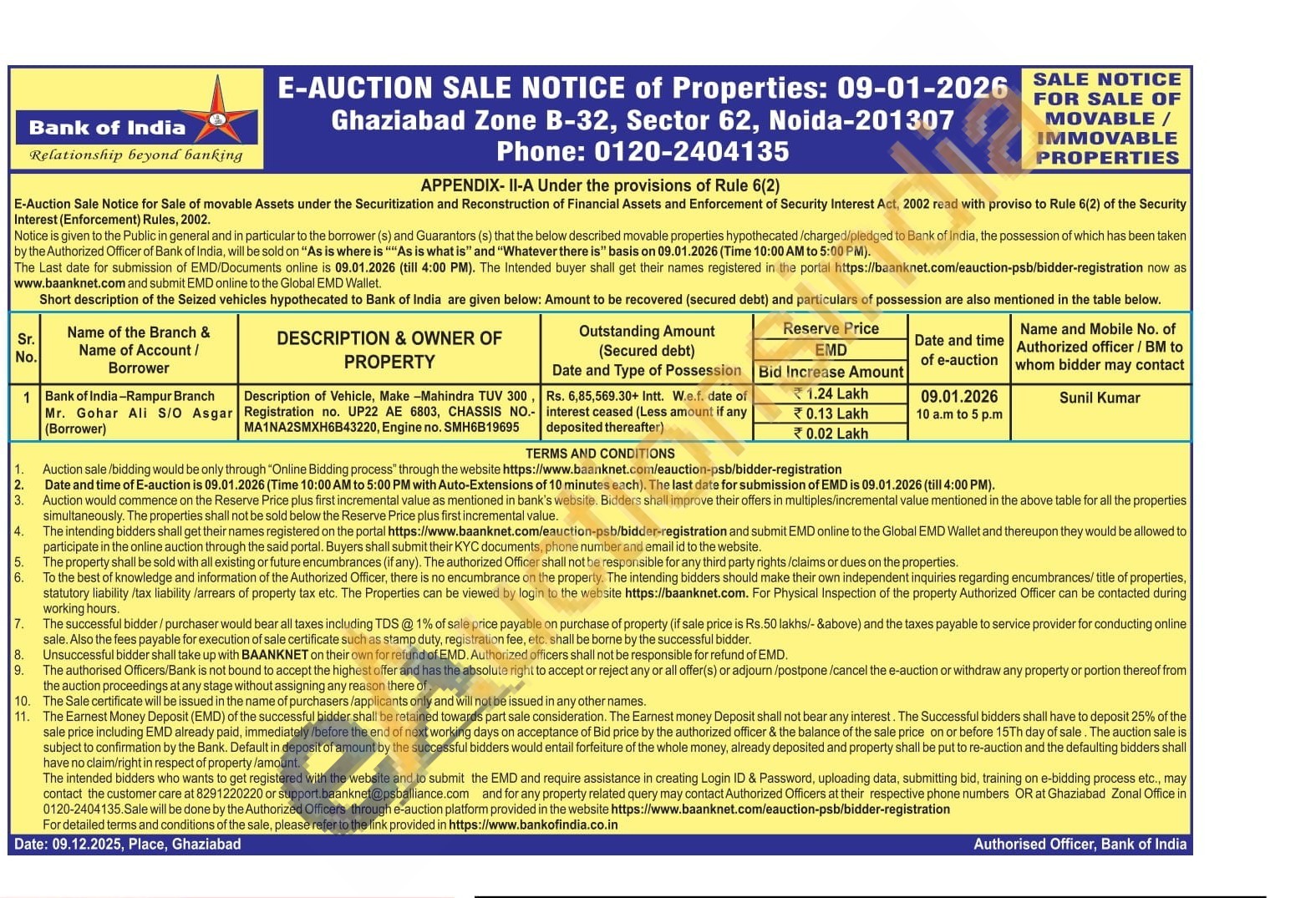 Description of Vehicle, Make-Mahindra TUV 300, Registration no. UP22 AE 6803, CHASSIS NO.-MA1NA2SMXH6B43220, Engine no. SMH6B19695