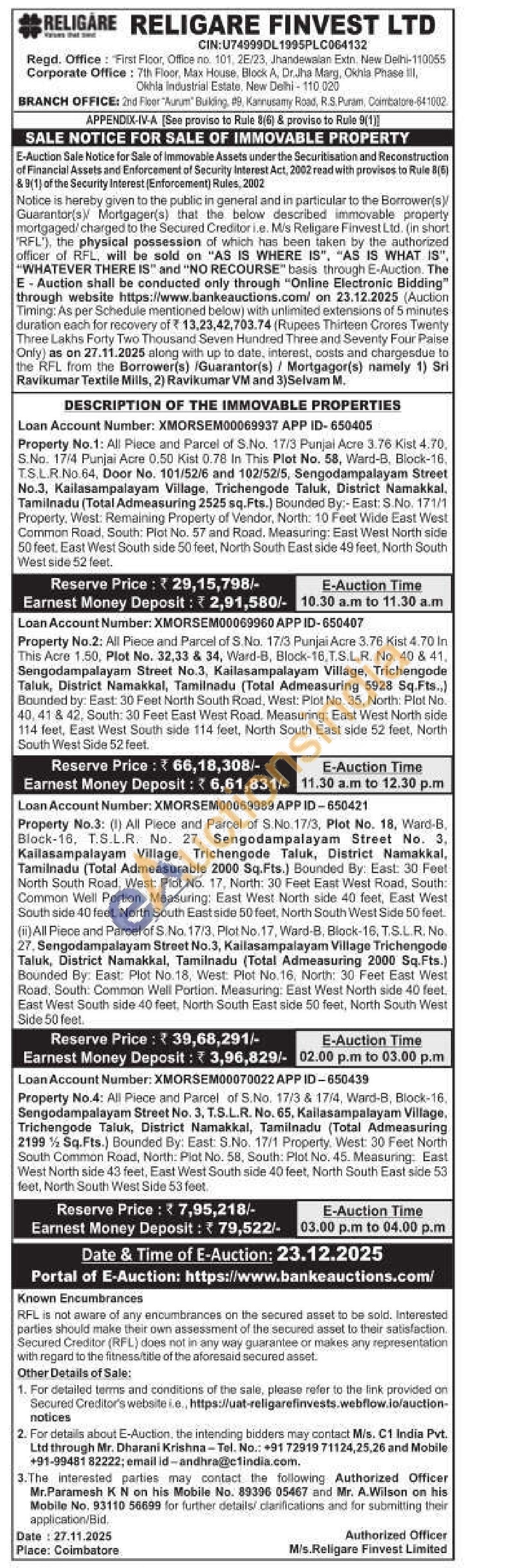 Property No.3: (1) All Piece and Parcel of S.No. 17/3, Plot No. 18, Ward-B. Block-16, T.S.L.R. No. 27. Sengodampalayam Street No. 3. Kailasampalayam Village, Trichengode Taluk, District Namakkal, Tamilnadu (Total Admeasurable 2000 Sq.Fts.) Bounded By: East: 30 Feet North South Road, West: Plot No. 17, North: 30 Feet East West Road, South: Common Well Portion. Measuring: East West North side 40 feet, East West South side 40 feet, North South East side 50 feet, North South West Side 50 feet (ii) All Piece and Parcel of S. No. 17/3, Plot No. 17, Ward-B, Block-16, T.S.L.R. No. 27. Sengodampalayam Street No.3, Kailasampalayam Village Trichengode Taluk, District Namakkal, Tamilnadu (Total Admeasuring 2000 Sq.Fts.) Bounded By: East: Plot No.18, West: Plot No.16, North: 30 Feet East West Road, South: Common Well Portion. Measuring: East West North side 40 feet. East West South side 40 feet, North South East side 50 feet, North South West Side 50 feet.