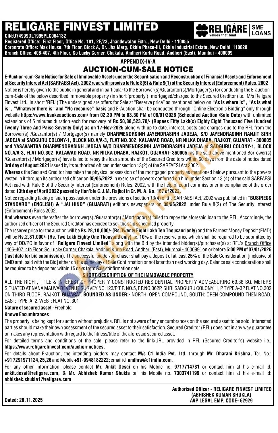 ALL THE RIGHT, TITLE & INTEREST OF PROPERTY CONSTRUCTED RESIDENTIAL PROPERTY ADMEASURING 69.36 SQ. METERS SITUATED AT NANA MAUVA REVENUE SURVEY NO.123/P T.P. NO.5, F.P.NO.362P, SHRI SADGURU COLONY 1, PTYPEA-3P FLAT NO.302 ON THIRD FLOOR, RAJKOT, GUJARAT. BOUNDED AS UNDER: NORTH: OPEN COMPOUND, SOUTH: OPEN COMPOUND THEN ROAD, EAST: TYPE A-2, WEST: FLAT NO. 301 Nature of secured asset - Freehold