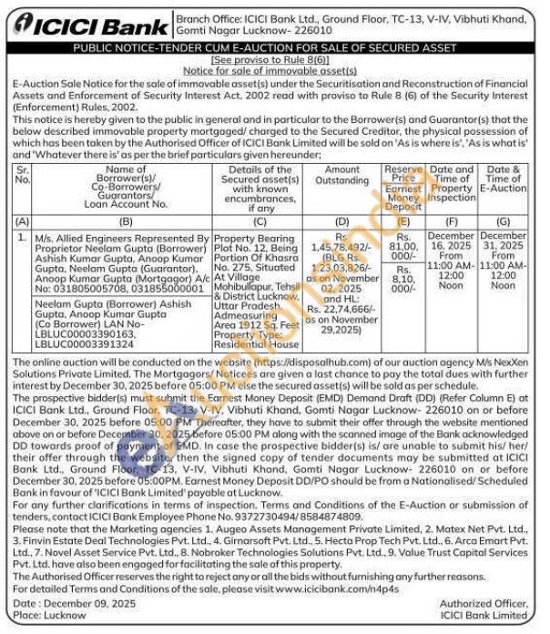 Property Bearing Plot No. 12, Being Portion Of Khasra No. 275. Situated At Village Mohibullapur, Tehsil & District Lucknow, Uttar Pradesh. Admeasuring Area 1912 Sq. Feet Property Type: Residential House
