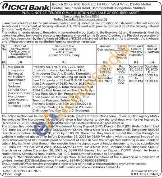 Property No. 478, K. No. 1292, Near Prassana Talkies, Opp. Mayura Clinic, Chitradurga City And District, Karnataka State-577501 Admeasuring An Area For Item 1 Property of 37 Feet X 34.50 Feet And Item 2 Property of 26.50 Feet X 10.50 Feet And Aggregating A Total Measurement of 1554 Sq. Feet Bounded on The:- North By:-Cross Road South By:- Property of Farkhunda Khan House of Ramana East By:-Road Towards Prassana Talkies West By:-Parizans Depot Civil Suit: Os 320/2024 Is Currently Pending For Orders In Pri Senior Civil Judge And Cjm Court, Chitradurga.