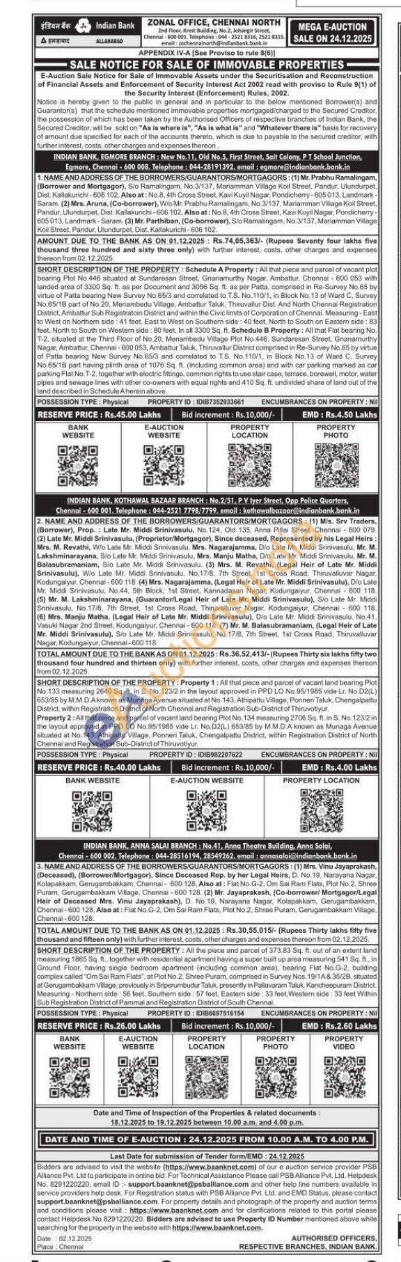 SHORT DESCRIPTION OF THE PROPERTY: Property 1: All that piece and parcel of vacant land bearing Plot No.133 measuring 2640 Sq. ft. in S. No. 1232 in the layout approved in PPD LO No. 95/1985 vide Lt. No D2(L) 653/85 by M.M.D.Aknown as Munaga Avenue situated at No. 143, Athipattu Village, Ponneri Taluk, Chengalpattu District, within Registration District of North Chennai and Registration Sub-District of Thiruvotyun Property 2: All that piece and parcel of vacant land bearing Plot No. 134 measuring 2706 5q. ft. in S.No. 123/2 the layout approved in PPD LO No 96/1985 vide Lr. No.02(L) 653/85 by MMDA known as Munaga Avenue situated at No. 143. Athipattu Village, Ponneri Taluk, Chengalpattu District, within Registration District of North Chennar and Registration Sub-District of Thiruvatiyur