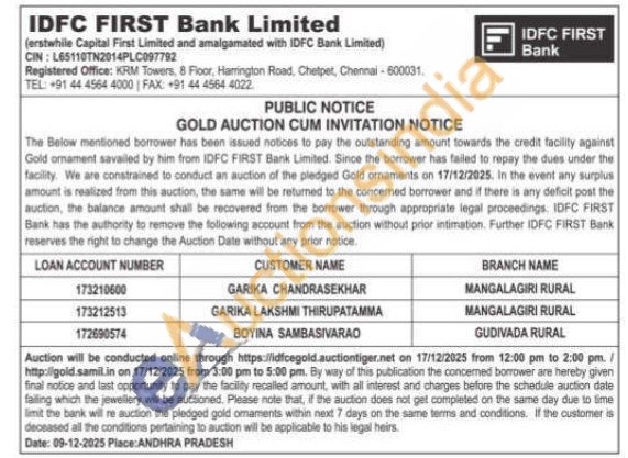 IDFC First Bank Ltd Gold Auctions Auction in Chennai