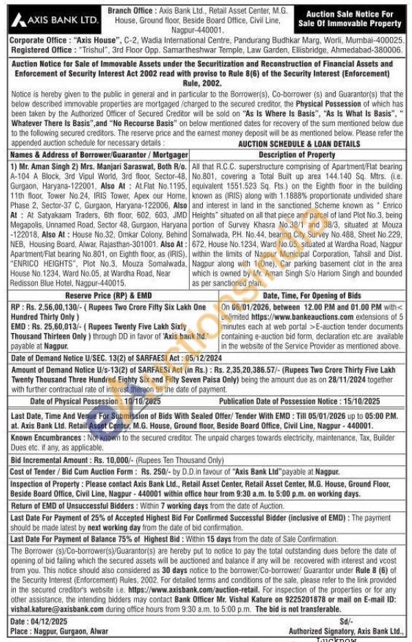 All that R.C.C. superstructure comprising of Apartment/Flat bearing , No.801, covering a Total Built up area 144.140 Sq. Mtrs. (ie. , equivalent 1551.523 Sq. Fts.) on the Eighth floor in the building , known as (IRIS) along with 1.1888% proportionate undivided share and interest in land in the sanctioned Scheme known as Enrico Heights situated on all that piece and parcel of land Plot No.3, being portion of Survey Khasra No.38/1 and 38/3, situated at Mouza Somalwada, P.H. No.44, bearing City Survey No.488, Sheet No.229, : 672, House No. 1234, Ward No.05, situated at Wardha Road, Nagpur , within the limits of Nagpur Municipal Corporation, Tahsil and Dist. , Nagpur along with 1(One), Car parking basement ciot in the area which is owned by Mr. Aman Singh S/o Hariom Singh and bounded as per sanctioned plan.