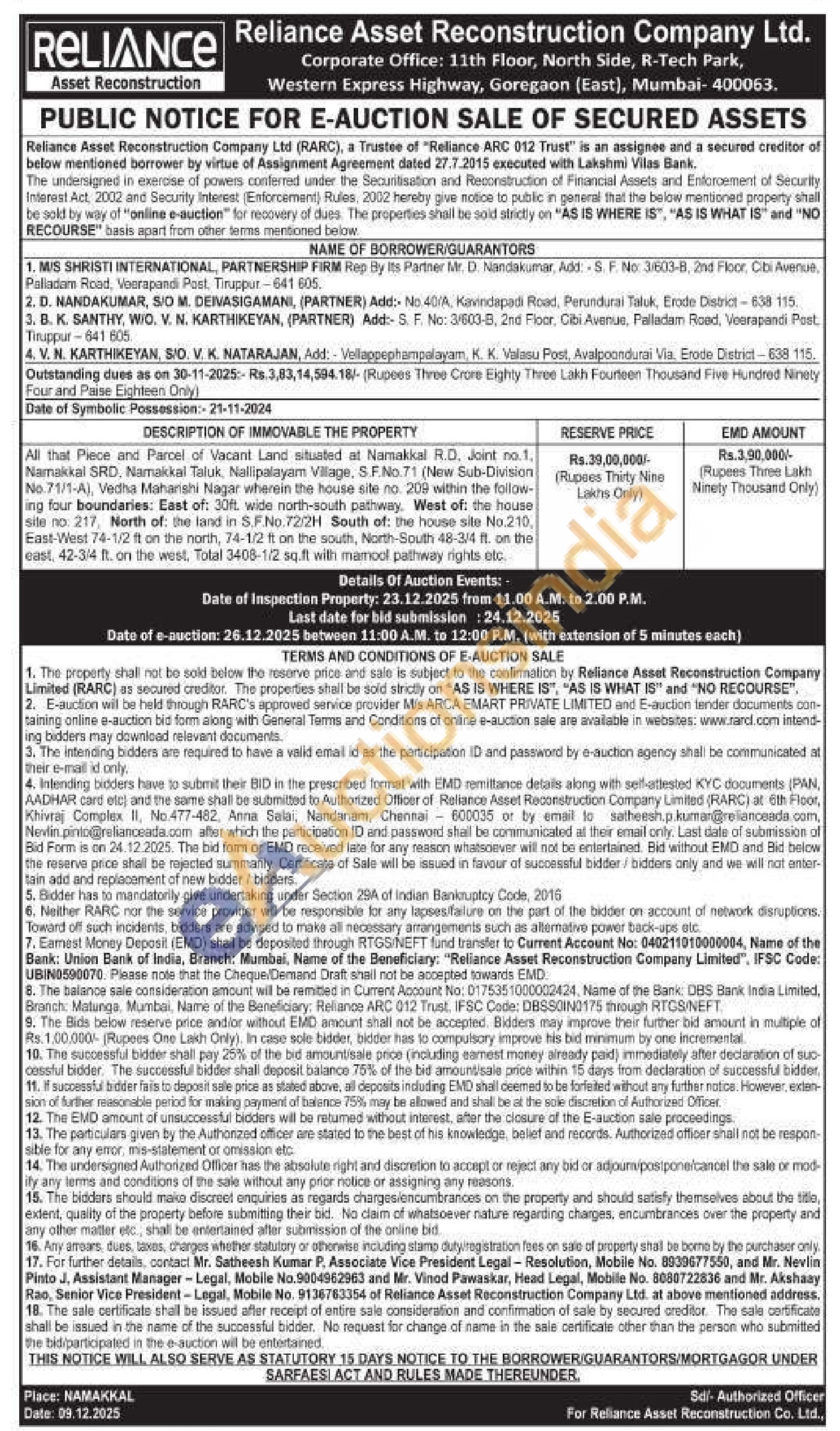 All that Piece and Parcel of Vacant Land situated at Namakkal R.D. Joint no.1, Namakkal SRD, Namakkal Taluk, Nallipalayam Village, S.F.No.71 (New Sub-Division No.71/1-A), Vedha Maharishi Nagar wherein the house site no. 209 within the follow-ing four boundaries: East of: 30ft, wide north-south pathway. West of: the house sile no: 217, North of: the land in S.F.No. 72/2H South of: the house site No.210, East-West 74-1/2 ft on the north, 74-1/2 ft on the south, North-South 48-3/4 ft. on the east, 42-3/4 ft. on the west, Total 3408-1/2 sq.ft with mamool pathway rights etc.
