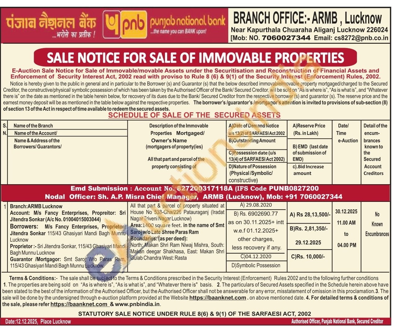 All that part & parcel of property situated at House No 538-Gha/226 Patauraganj (Iradat Nagar Triveni Nagar Lucknow)Area:1400 square feet. in the name of Smt Saroj w/o Late Shree Paras Ram Boundaries: (as per deed):North: Makan Shri Ram Niwaj Mishra, South: Makan deegar Shakhasa, East: Makan Shri Gulab Chandra West: Rasta