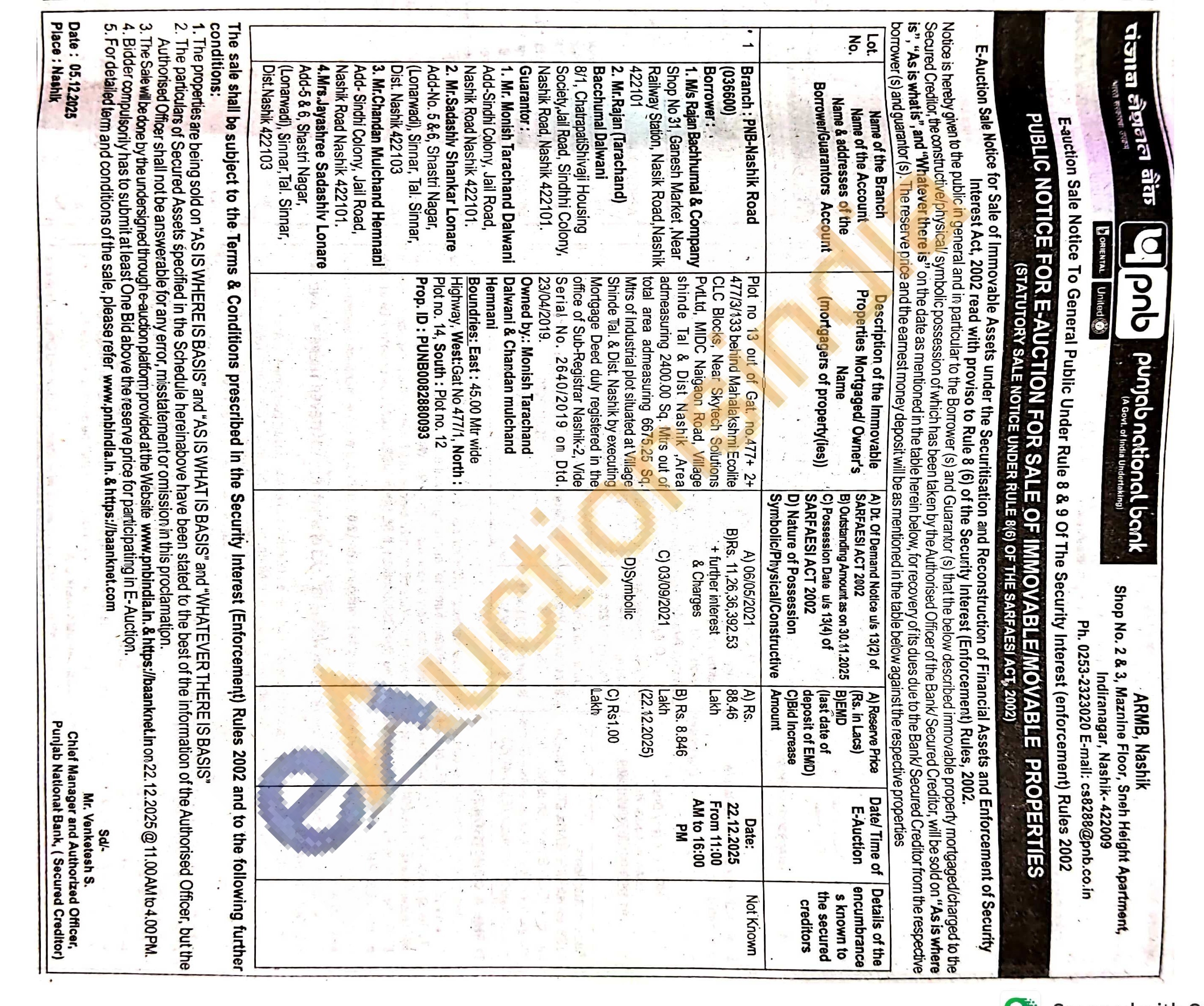 Plot no 13 out of Gat. no.477+ 2+ 477/3/133 behind Mahalakshmi Ecolite CLC Blocks, Near Skytech Solutions PvtLtd, MIDC Naigaon Road, Village shinde Tal & Dist Nashik Area admeasuring 2400.00 Sq. Mtrs out of total area admeasuring 6675.25 Sq. Mtrs of Industrial plot situated at Village Shinde Tal. & Dist. Nashik by executing Mortgage Deed duly registered in the office of Sub-Registrar Nashik-2, Vide Serial No. 2640/2019 on Dtd. 23/04/2019.