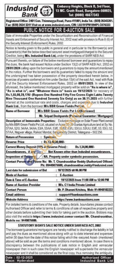 Description of Immovable Properties: Exclusive mortgage on Solar Power Plant owned by Mis BBR Green Fields Pvt Ltd, situated on Acres 35-39 Guntas Agriculture land at Sy. No. 57/AA, 52/U, 54/AA, 54/AA, 53/A, 53/AA, 53/E, 53/EE, 53/U, 53/UU, 53/UU, 53/E, 53, 53/1, 52, 57/AA. Nagwar village, Raikod Mandal, Sangareddy District, Telangana-502256