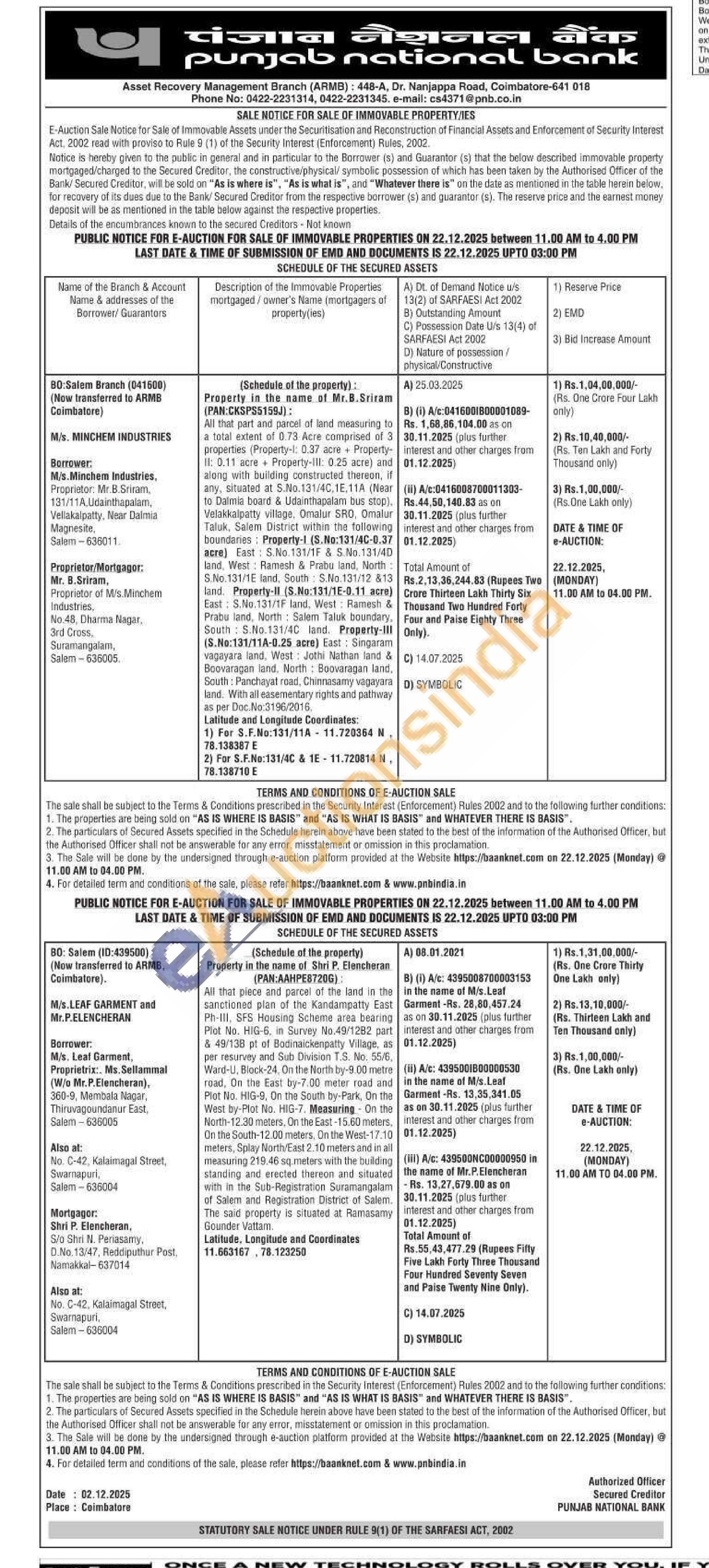 Property in the name of Mr.B.Sriram (PAN:CKSPSS159J): All that part and parcel of land measuring to a total extent of 0.73 Acre comprised of 3 properties (Property-l: 0.37 acre Property II: 0.11 acre Property-III: 0.25 acre) and along with building constructed thereon, if any, situated at S.No. 131/4C, 1E,11A (Near to Dalmia board & Udainthapalam bus stop), Velakkalpatty village. Omalur SRO, Omalur Taluk, Salem District within the following boundaries: Property-I (S. No:131/4C-0.37 acre) East S.No. 131/1F & S.No. 131/40 land, West: Ramesh & Prabu land, North S.No.131/1E land, South: S.No.131/12 &13 land. Property-II (S.No:131/1E-0.11 acre) East: S.No. 131/1F land, West: Ramesh & Prabu land, North Salem Taluk boundary. South S.No. 131/4C land. Property-III (S.No:131/11A-0.25 acre) East: Singaram vagayara land, West: Jothi Nathan land & Boovaragan land, North Boovaragan land. South: Panchayat road, Chinnasamy vagayara land. With all easementary rights and pathway as per Doc. No:3196/2016