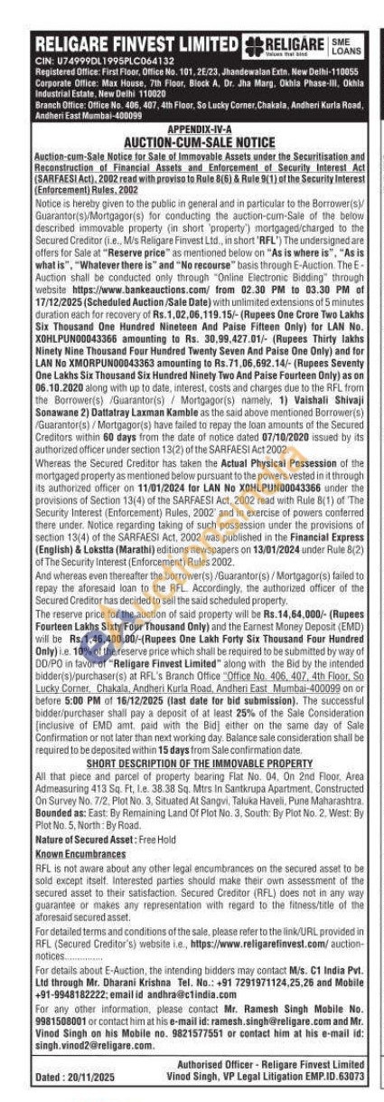 All that piece and parcel of property bearing Flat No. 04. On 2nd Floor, Area Admeasuring 413 Sq. Ft, l.e. 38.38 Sq. Mtrs in Santkrupa Apartment, Constructed On Survey No. 7/2, Plot No. 3, Situated At Sangvi, Taluka Haveli, Pune Maharashtra. Bounded as: East: By Remaining Land Of Plot No. 3, South: By Plot No. 2. West: By Plot No. 5, North: By Road. Nature of Secured Asset: Free Hold