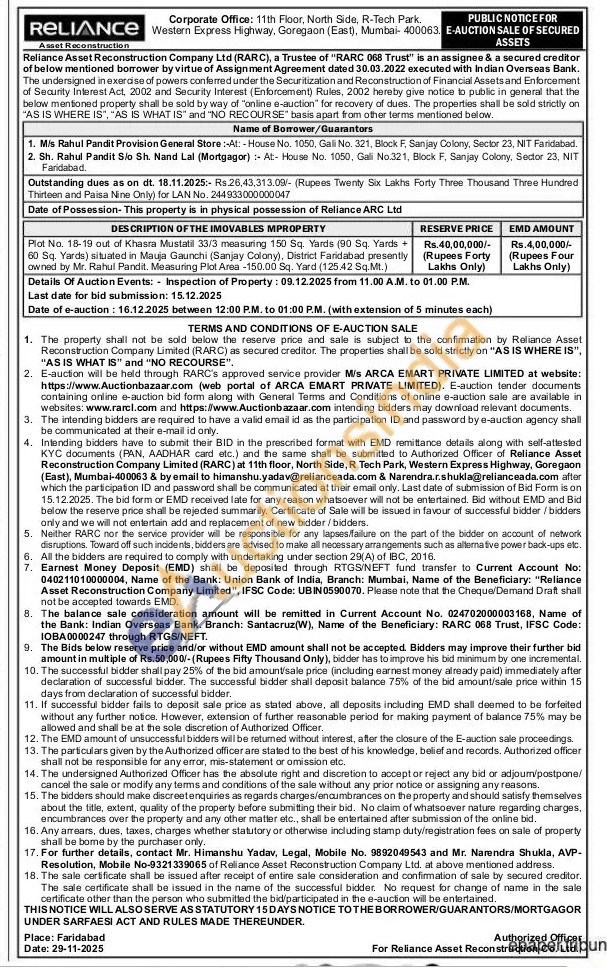 Plot No. 18-19 out of Khasra Mustatil 33/3 measuring 150 Sq. Yards (90 Sq. Yards + 60 Sq. Yards) situated in Mauja Gaunchi (Sanjay Colony), District Faridabad presently owned by Mr. Rahul Pandit. Measuring Plot Area -150.00 Sq. Yard (125.42 Sq.Mt.)