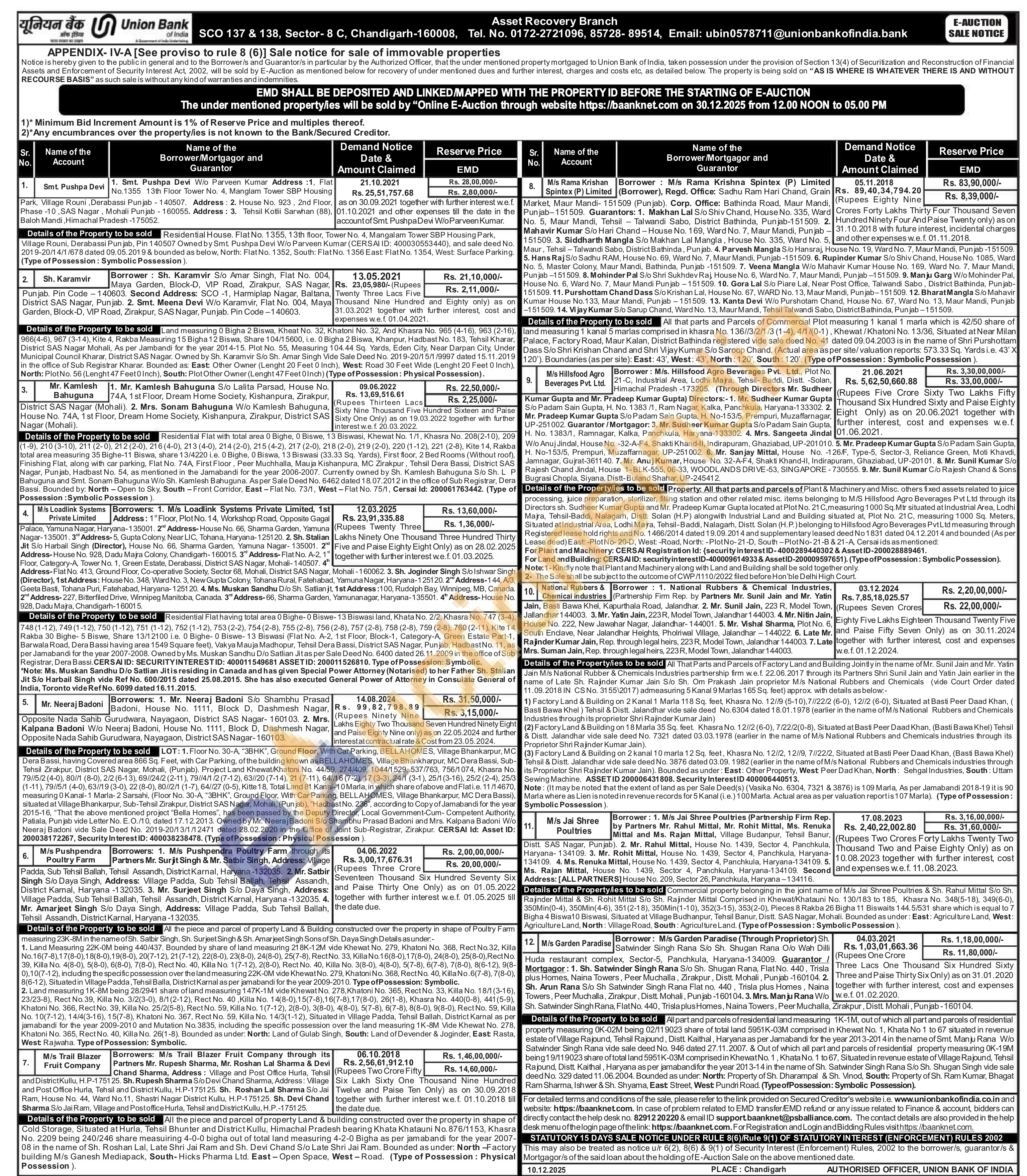 All that parts and parcels of Plant & Machinery and Misc. others fixed assets related to juice processing, juice preparation, sterilizer, filling station and other related misc. items belonging to M/S Hillsfood Agro Beverages Pvt Ltd through its Directors sh. Sudheer Kumar Gupta and Mr. Pradeep Kumar Gupta located at Plot No. 21 C, measuring 1000 Sq. Mtr situated at Industrial Area, Lodhi Majra, Tehsil-Baddi, Nalagarh, Distt. Solan (H.P) alongwith Industrial Land and Building situated at, Plot No. 21C, measuring 1000 Sq. Meters, Situated atIndustrial Area, Lodhi Majra, Tehsil-Baddi, Nalagarh, Distt Solan (H.P.) belonging to Hillsfood Agro Beverages PvtLtd measuring through Registered lease hold rights and No. 1466/2014 dated 19.09.2014 and supplementary leased deed No 1831 dated 04.12.2014 and bounded (As per Lease deed) East: -Plot No-20-D, West: -Road, North: -Plot No-21-D, South-Plot No-21-B & 21-A, Cersai ids as mentioned: