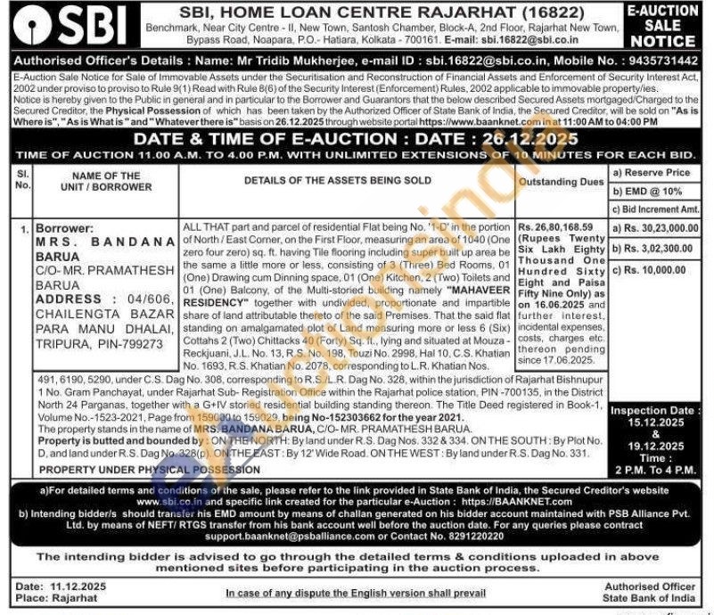 ALL THAT part and parcel of residential Flat being No. '1-D' in the portion of North/East Corner, on the First Floor, measuring an area of 1040 (One zero four zero) sq. ft. having Tile flooring including super built up area be the same a little more or less, consisting of 3 (Three) Bed Rooms, 01 (One) Drawing cum Dinning space, 01 (One) Kitchen, 2 (Two) Toilets and 01 (One) Balcony, of the Multi-storied building namely "MAHAVEER RESIDENCY" together with undivided, proportionate and impartible share of land attributable thereto of the said Premises. That the said flat standing on amalgamated plot of Land measuring more or less 6 (Six) Cottahs 2 (Two) Chittacks 40 (Forty) Sq. ft., lying and situated at Mouza-Reckjuani, J.L. No. 13, R.S. No. 198, Touzi No. 2998, Hal 10, C.S. Khatian No. 1693, R.S. Khatian No. 2078, corresponding to L.R. Khatian Nos.491, 6190, 5290, under C.S. Dag No. 308, corresponding to R.S./L.R. Dag No. 328, within the jurisdiction of Rajarhat Bishnupur 1 No. Gram Panchayat, under Rajarhat Sub-Registration Office within the Rajarhat police station, PIN-700135, in the District North 24 Parganas, together with a G+IV storied residential building standing thereon. The Title Deed registered in Book-1,Volume No.-1523-2021, Page from 159000 to 159029, being No-152303662 for the year 2021.