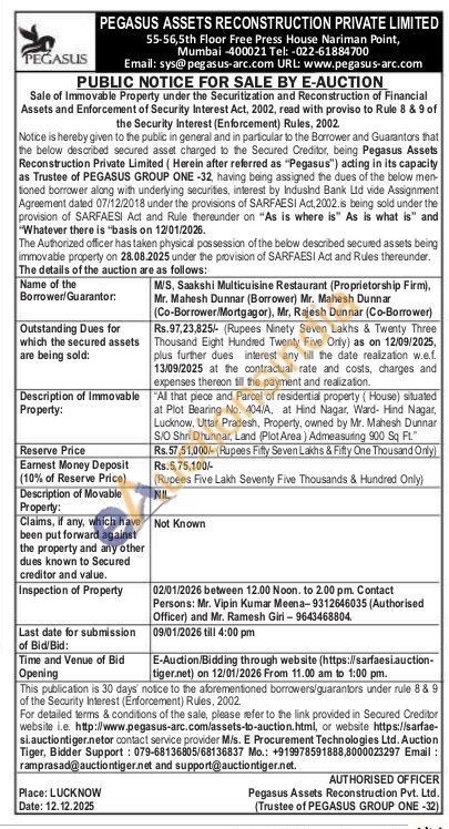 "All that piece and Parcel of residential property (House) situated at Plot Bearing No. 404/A, at Hind Nagar, Ward- Hind Nagar, Lucknow, Uttar Pradesh, Property, owned by Mr. Mahesh Dunnar S/O Shri Dhunnar, Land (Plot Area) Admeasuring 900 Sq Ft"