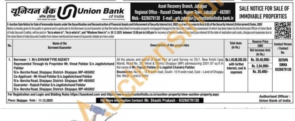 All the pieces and parcel of Open Plot at Land Survey no 25/1, New Krishi Upaj Mandi. Ward No. 29, Tehsil & District Shajapur (MP) admeasuring 3201.07 sq ft in the name of Mr. Rajesh Patidar S/o Jagdish Chandra Patidar. Boundaries-North-15 It wide road, South-15 ft wide road, East-Land of Dhappu Bai, West-Land of Seller