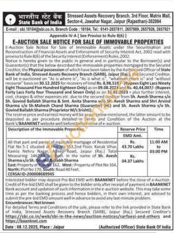 All that part and parcel of equitable mortgage of Residential Flat No 5-1 situated at Plot No-165,2nd Floor, Kanak Vihar Kamila Nehru Nagar, Ajmer Road, Jaipur (Raj) Total Measuring: 1467.68 Sq. Feet. In the name of Sh. Avesh Sharma s/o Sh. Govind Ballabh Sharma