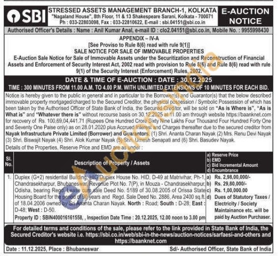 a) Duplex (G+2) residential Building, HIG Duplex House No. HID, D-49 at Matrivihar, Ph-1, Chandrasekharpur, Bhubaneswar, Revenue Plot No. 7(P), in Mouza Chandrasekharpur, b) Odisha, bearing Regd. Lease cum sale Deed No. 5189 of 30.08.2005 of Orissa Stateic) Housing Board for the period of 90 years and Regd. Sale Deed No. 2886, Area 2400 sq.ft. d) of 18.04.2006 owned by Sri Ananta Charan Nayak. North: Road, South: D-28. East: D-48: West: D-50.