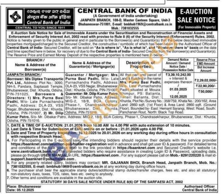 . All that part and parcel of Land & Building in the name Mrs. Purna Basi Padhi, W/o- Late Punachandra Padhi situated at Mouza Bhimpur, PS: Balianta, Tehsil: Balianta, Dist.: Khurda, Plot No./Survey No.: 358/759, Khata No.: 200/162, Area Land: 2860 sqft. (1st Floor) & Area Land: 2860 sqft. (Ground Floor). Bounded by- East: Hemant Sarangi, West: Road, South: Panchanan Rout, North: Black Top Road