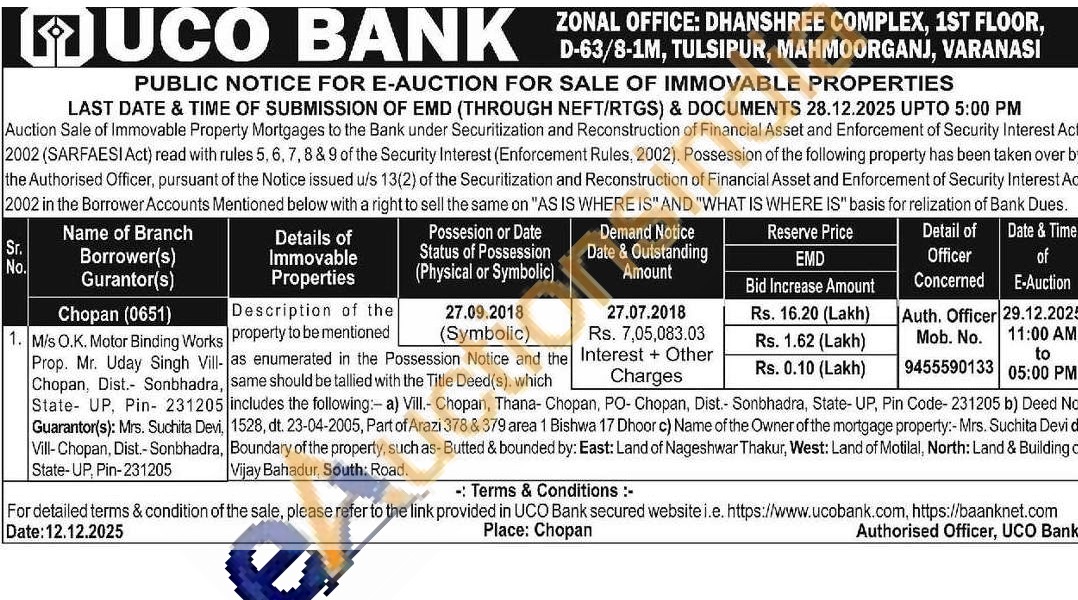 a) Vill.- Chopan, Thana- Chopan, PO- Chopan, Dist.- Sonbhadra, State-UP, Pin Code-231205 b) Deed No Devi, 1528, dt. 23-04-2005, Part of Arazi 378 & 379 area 1 Bishwa 17 Dhoor c) Name of the Owner of the mortgage property:- Mrs. Suchita Boundary of the property, such as-Butted & bounded by: East: Land of Nageshwar Thakur, West: Land of Motilal, North: Land & Building c Vijay Bahadur, South: Road
