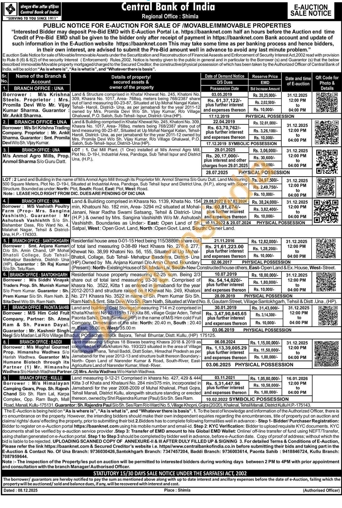 Land measuring 1 bighas 18 Biswas bearing Khasra 2018 & 2019 as comprised in Khata/khatoni No. 193/223 situated in the area of Village Kishanpura Thana, Tehsil Baddi, Distt Solan, Himachal Pradesh as per Jamabandi for the year 2012-13 and structure built thereon Boundary: North- Open Land of Narender Kumar & Road, South-River, East-Agriculture Land of Narender Kumar, West-River