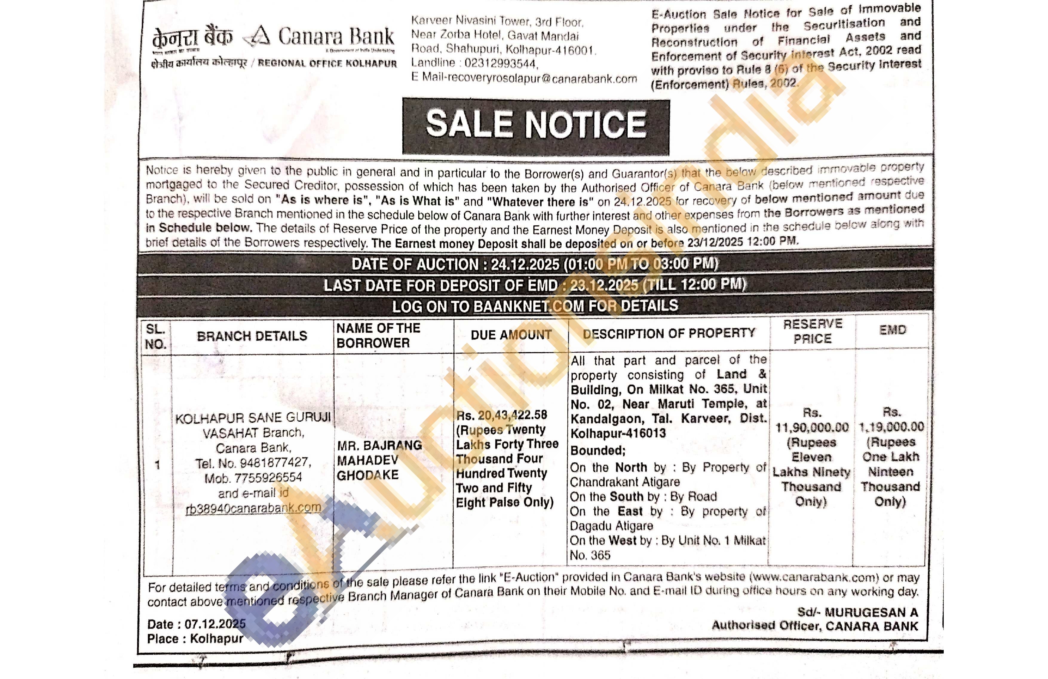 All that part and parcel of the property consisting of Land & Building, On Milkat No. 365, Unit No. 02, Near Maruti Temple, at Kandalgaon, Tal. Karveer, Dist. Kolhapur-416013 Bounded On the North by By Property of Chandrakant Atigare On the South by: By Road On the East by By property of Dagadu Atigare. On the West by: By Unit No. 1 Milkat No. 365