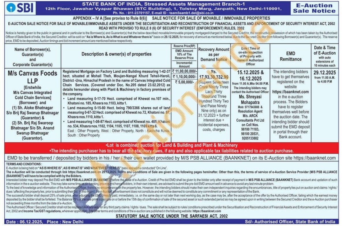 Registered Mortgage on Factory Land and Building measuring 1-42-37 hect. situated at Mohall Theh, Moujan-Nangal Khurd Tehsil-Haroli, District-Una, Himachal Pradesh in the name of Canvas Integrated Cold Chain Services. (Covered under Doc. No.205 dated 23.02.2012) as details hereunder along with Plant & Machinery in factory premises of the company.Land measuring 0-17-70 Hect. comprised of Khewat no.107 min., Khatoni no. 185, Khasra no. 1103, kitta 1. Land measuring 0-15-80 Hect, being 790/3366 shares out of land measuring 0-67-32 Hect. comprised of Khewat no.72, Khatoni no. 97, Khasra nos. 1110, kitta 1. Land measuring 1-08-87 Hect, comprised of Khewat no. 405, Khatoni no. 534, Khasra nos. 1102, 1104, 1105, 1107, 1108, 1109 kitta 6. East: Other Property, West: Other Property, North Kachcha Rasta. South: Other Property