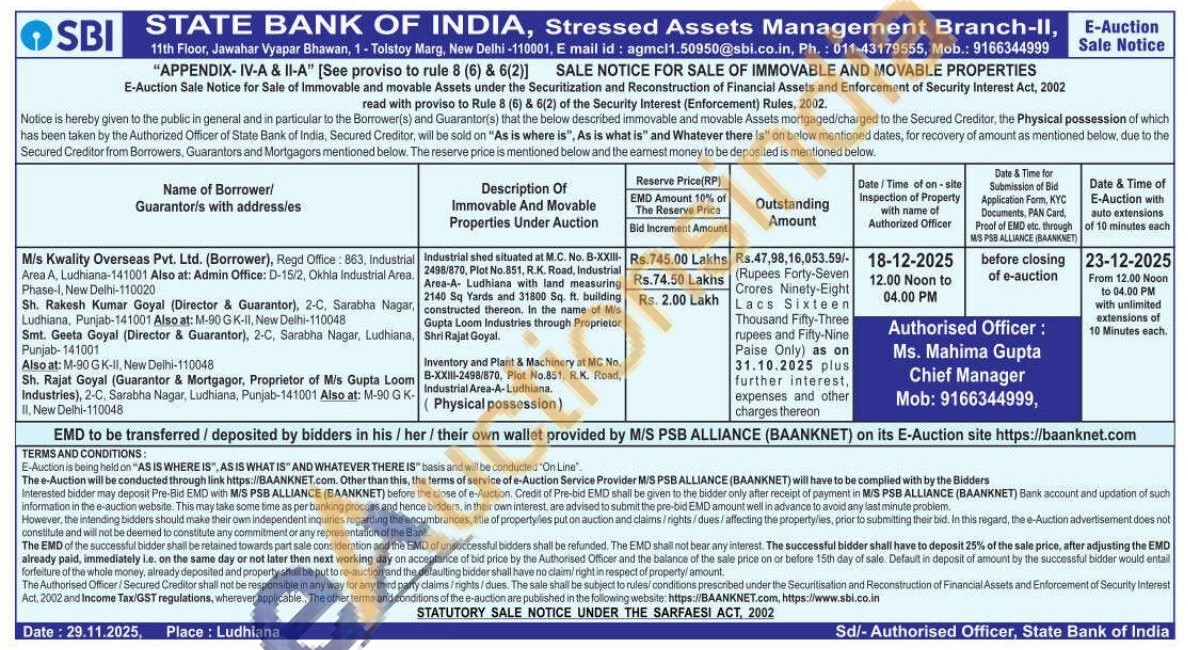 Industrial shed situated at M.C. No. B-XXIII-2498/870, Plot No.851, R.K. Road, Industrial Arsa-A- Ludhiana with land measuring 2140 Sq Yards and 31800 Sq. ft. building ting constructed thereon. In the name of Mis Gupta Loom Industries through Proprietor Shri Rajat Goyal.Inventory and Plant & Machinery at MC No. B-XXIII-2498/870, Plot No.851, R.K. Road, Industrial Area-A-Ludhiana