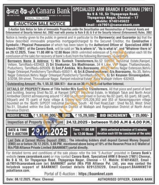 All that piece and parcel of land and building, bearing Shed No.52. at Ranipet SIPCOT Industrial Estate, In Wallajah Taluk and North Arcot Ambedkar District admeasuring around 17.400 sq.sft comprised in Survey No. 62 (part), 63 (part), 68 (part). 69(part) and 70 (part) of Karai village & Survey Nos. 225,226,352 and 353 of Narasingapuram village bounded on the North: SIPCOT Industrial Complex, South: 40 Feet Road, East Shed No 53. West: Shed No.51, Situated within the Sub Registration District of Wallajah and Registration District of North Arcot Revenue District.
