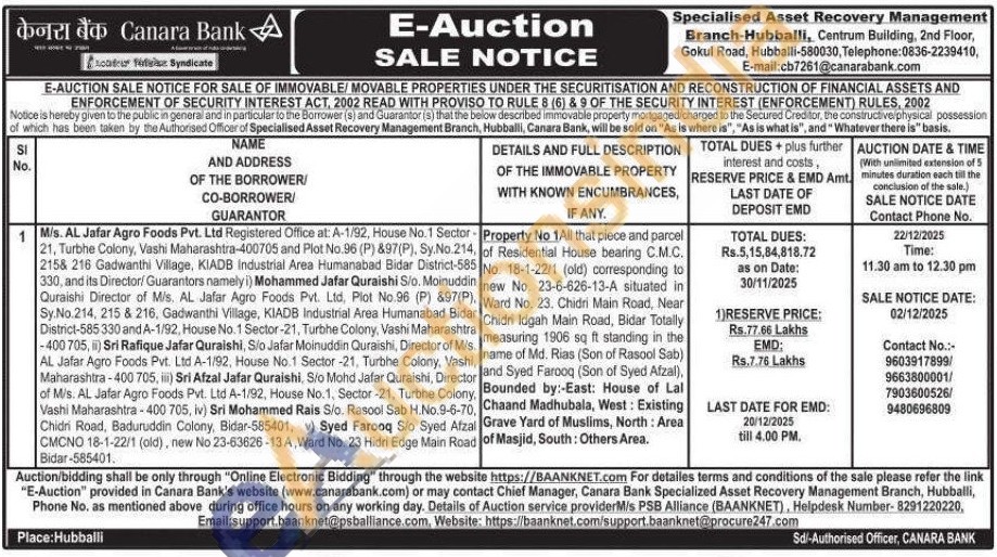 Property No 1All that piece and parcel , of Residential House bearing C.M.C. No. 18-1-22/1 (old) corresponding to new No. 23-6-626-13-A situated in Ward No. 23. Chidri Main Road, Near Chidri Idgah Main Road, Bidar Totally measuring 1906 sq ft standing in the name of Md. Rias (Son of Rasool Sab) and Syed Farooq (Son of Syed Afzal),, Bounded by:-East: House of Lal , Chaand Madhubala, West: Existing Grave Yard of Muslims, North: Area of Masjid, South: Others Area.