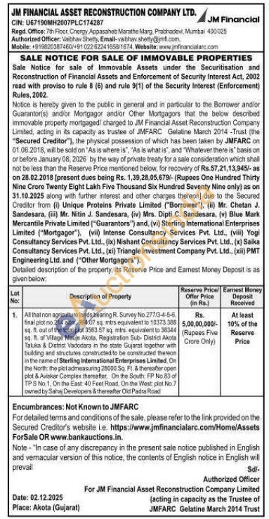 All that non agriculture lands bearing R. Survey No 277/3-4-5-6, final pict no 214 adm. 964.07 sq. mtrs equivalent to 10373 388 sq. ft. out of the total plot 3563.57 sq. mirs equivalent to 38344 sq. ft. of Village Mauje Akota, Registration Sub-District Akota Taluka & District Vadodara in the state Gujarat together with building and structures constructed to be constructed thereon in the name of Sterling International Enterprises Limited. On the North: the plot admeasuring 28000 Sq Ft. & thereafter open plot & Aviskar Complex thereafter, On the South: FP No.83 of TPS No 1. On the East: 40 Feet Road, On the West: plot No.7 owned by Sahay Developers & thereafter Old Padra Road