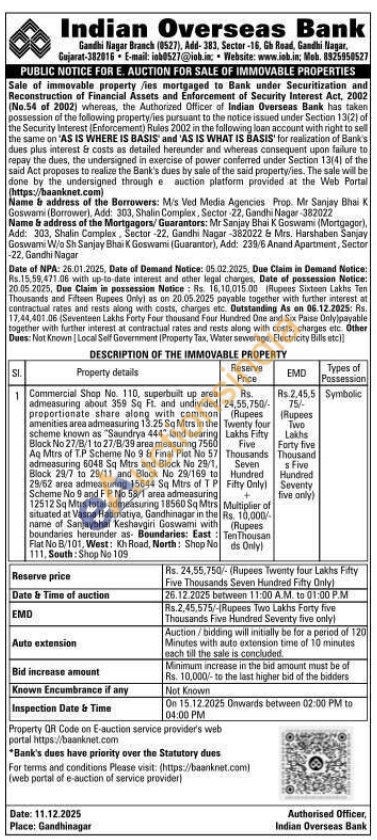 1 Commercial Shop No. 110, superbuilt up area admeasuring about 359 Sq Ft. and undivided proportionate share along with common amenities area admeasuring 13.25 Sq Mtrs in the scheme known as "Saundrya 444" land bearing Black No 27/8/1 to 27/B/39 area measuring 7560 Aq Mtrs of T.P Scheme No 9 & Final Plot No 57 admeasuring 6048 Sq Mitrs and Block No 29/1, Black 29/7 to 29/11 and Block Ne 29/169 to 29/62 area admeasuring 15644 Sq Mtrs of TP Scheme No 9 and FP No 58/1 area admeasuring 12512 Sq Mitrs total admeasuring 18560 Sq Mtrs situated at Vasna Hadmatiya, Gandhinagar in the name of Sanjaybhai Keshavgiri Goswami with boundaries hereunder as Boundaries: East: Flat No B/101, West: KhRoad, North: Shop No 111, South: Shop No 109
