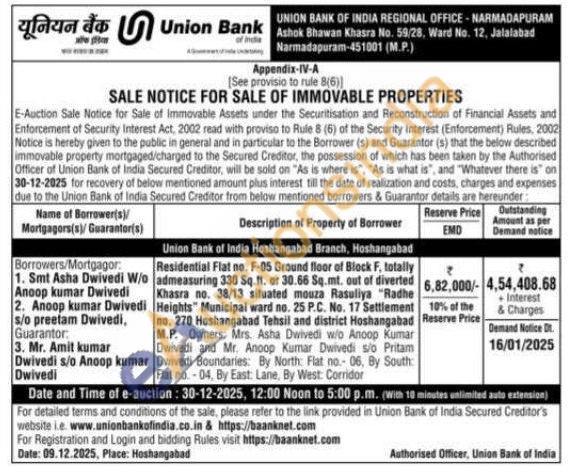 Residential Flat no. F-05 Ground floor of Block F, totally admeasuring 330 Sq.ft. or 30.66 Sq.mt. out of diverted Khasra no. 38/13 situated mouza Rasuliya "Radhe Heights" Municipal ward no. 25 P.C. No. 17 Settlement no. 270 Hoshangabad Tehsil and district Hoshangabad M.P.
