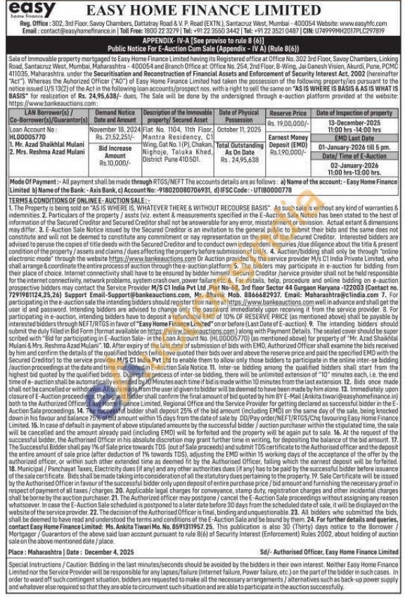 Fiat No. 1104, 11th Floor, Mantra Residency, C Wing, Gat No. 1(P), Chakan, Nighoje, Taluka Khed. District Pune 410501