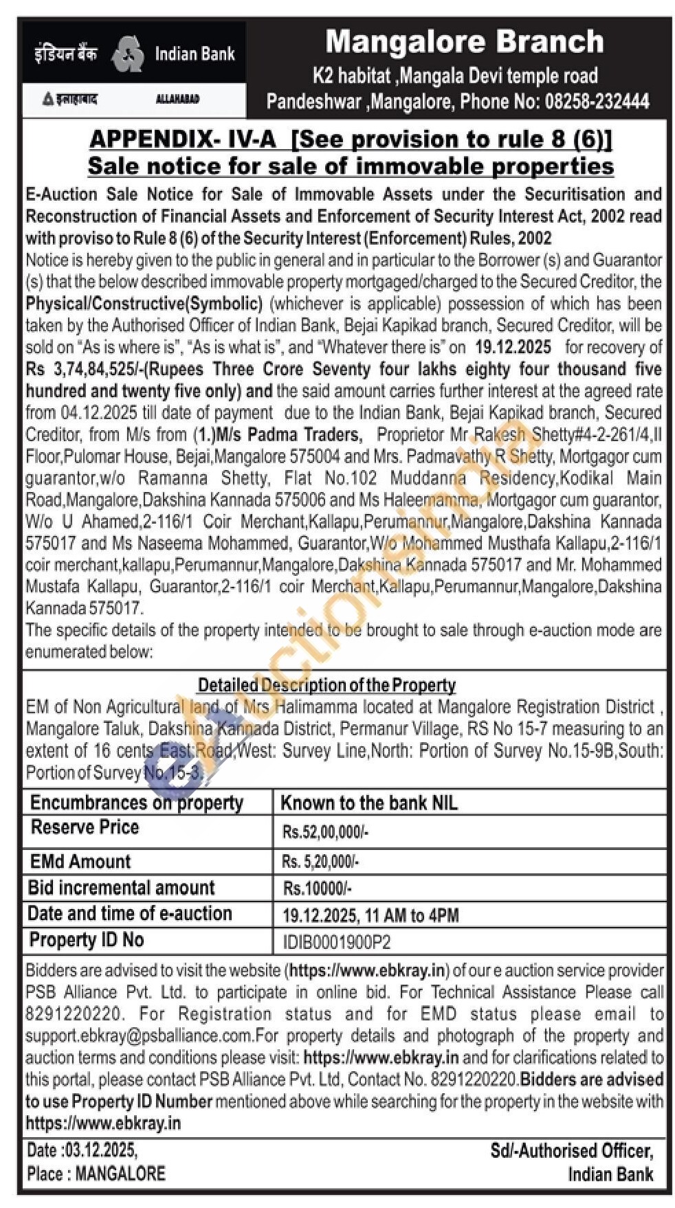 EM of Non Agricultural land of Mrs Halimamma located at Mangalore Registration District, Mangalore Taluk, Dakshina Kannada District, Permanur Village, RS No 15-7 measuring to an extent of 16 cents East:Road, West: Survey Line, North: Portion of Survey No.15-9B, South: Portion of Survey No.15-3.