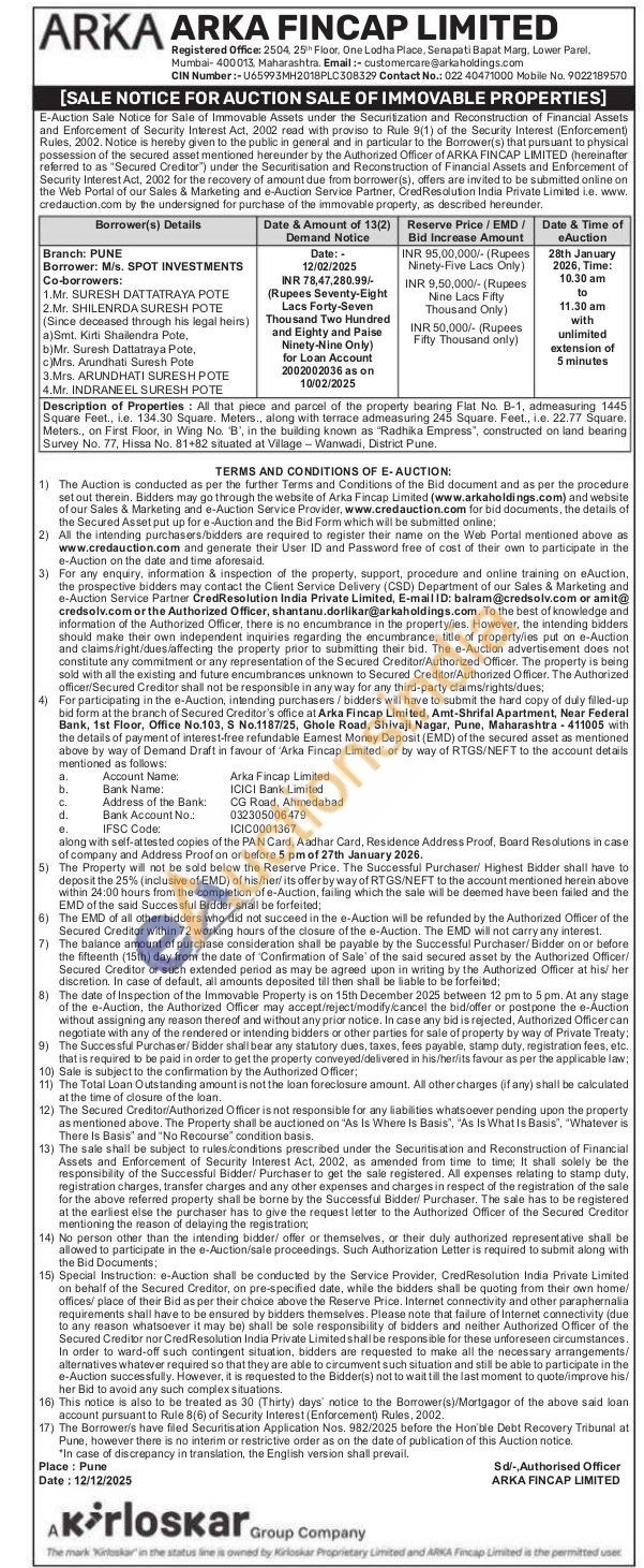 Description of Properties: All that piece and parcel of the property bearing Flat No. B-1, admeasuring 1445 Square Feet., i.e. 134.30 Square. Meters., along with terrace admeasuring 245 Square. Feet., I.e. 22.77 Square. Meters., on First Floor, in Wing No. 'B', in the building known as "Radhika Empress", constructed on land bearing Survey No. 77, Hissa No. 81+82 situated at Village - Wanwadi, District Pune