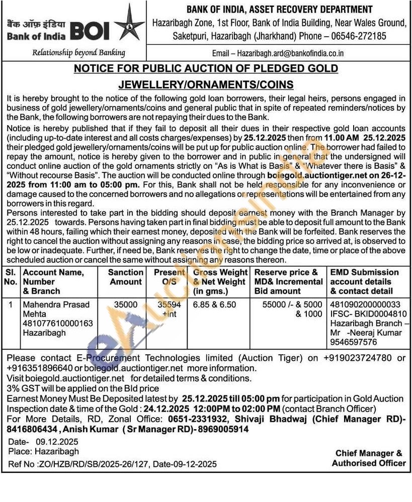Bank of India Gold Auctions Auction in Hazaribagh
